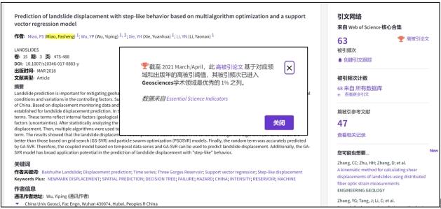 (通讯员:黄静)根据20217月基本科学指标数据库(Essential Science Indicators,简称ESI)最新数据显示,我院苗发盛副教授、吴益平教授团队于2018年在国际工程地质领域顶级期刊《Landslides》上发表的学术论文“Prediction of landslide displacement with step-like behavior based on multialgorithm optimization and a support vector regression model” 入选ESI高被引论文(Highly Cited Paper)。