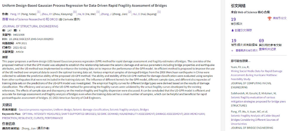 (通讯员:黄静)根据2022年3月基本科学指标数据库(Essential Science Indicators,简称ESI)最新数据显示,我院土木工程与力学系庞于涛副教授团队于2021年在国际结构工程领域顶级期刊Journal of Structural Engineering上发表的学术论文“Uniform design–based Gaussian process regression for data-driven rapid fragility assessment of bridges”入选ESI高被引论文(Highly Cited Paper)。