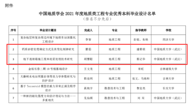 (通讯员 陈婵)近日,中国地质学会公布了2021年度地质类工程专业优秀本科毕业设计名单,本次全国共评选出16篇优秀本科毕业设计,全校有4篇毕业设计入选,我院入选2篇。