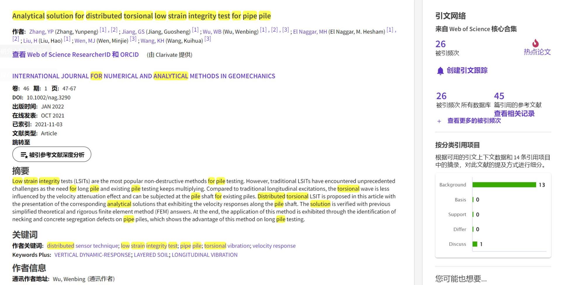 (通讯员 黄静)根据2022年9月基本科学指标数据库(Essential Science Indicators,简称ESI)最新数据显示,必赢线路检测中心勘察与基础工程系吴文兵教授团队于2021年在国际岩土工程数值计算权威期刊International Journal for Numerical and Analytical Methods in Geomechanics上发表的学术论文“Analytical solution for distributed torsional low strain integrity test for pipe pile”入选ESI热点论文(Hot Paper)。该论文第一作者为2020级博士研究生张云鹏,通讯作者为吴文兵教授,必赢线路检测中心为第一署名单位。