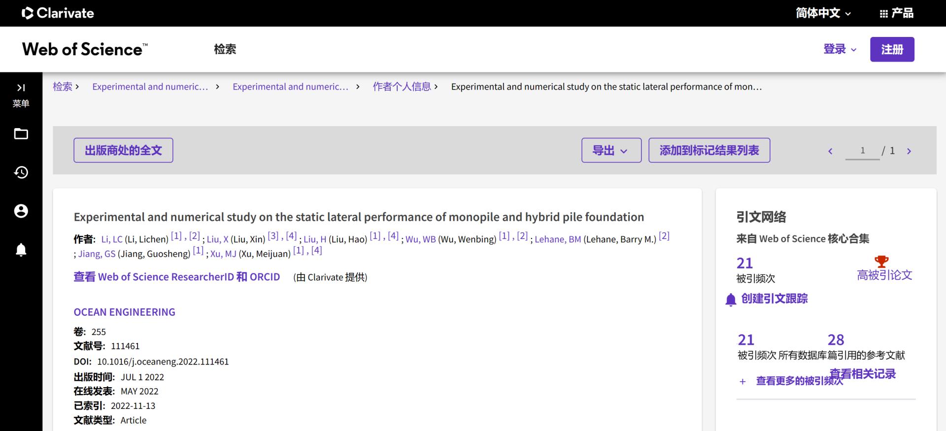 (通讯员 吴文兵)根据2023年6月基本科学指标数据库(Essential Science Indicators,简称ESI)最新数据显示,必赢线路检测中心勘察与基础工程系蒋国盛教授团队于2022年在国际海洋岩土领域权威期刊Ocean Engineering上发表的学术论文“Experimental and numerical study on the static lateral performance of monopile and hybrid pile foundation”入选ESI高被引论文。该论文第一作者为勘察与基础工程系博士后李立辰,通讯作者为吴文兵教授,必赢线路检测中心为第一署名单位。