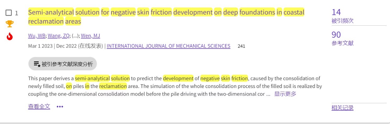 (通讯员 黄静)根据2023年7月基本科学指标数据库(Essential Science Indicators,简称ESI)最新数据显示,必赢线路检测中心勘察与基础工程系吴文兵教授团队于2023年在国际工程力学领域权威期刊International Journal of Mechanical Sciences(IF: 7.3, 中科院一区TOP)上发表的学术论文“Semi-analytical solution for negative skin friction development on deep foundations in coastal reclamation areas”同时入选ESI热点论文和高被引论文。该论文第一作者为吴文兵教授,第二作者为勘察与基础工程系王宗琴硕士,必赢线路检测中心为第一署名单位。