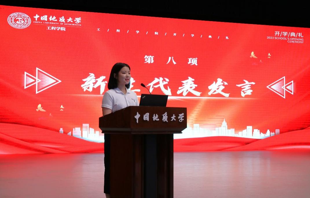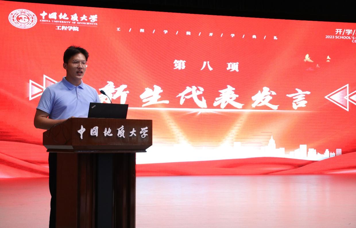 2023级05D231班张高涵同学作为本科生新生代表发言。他说,在长辈厚重岩土气息的熏陶下,自己终于如愿考进地质大学,加入必赢线路检测中心。他对开学报到以来学院领导老师给予的教育关怀表示感谢,对军事训练当中空军预警学院教官对自己坚忍毅力和良好作息的打造由衷感激,他立志与其他505名本科新生同学一道,以强国建设、民族复兴的时代号召为号角,以“品德高尚、基础厚实、专业精深、知行合一”的成才目标为向导,直挂云帆,乘风破浪,早日成为德智体美劳全面发展的中国特色社会主义事业的建设者和接班人。